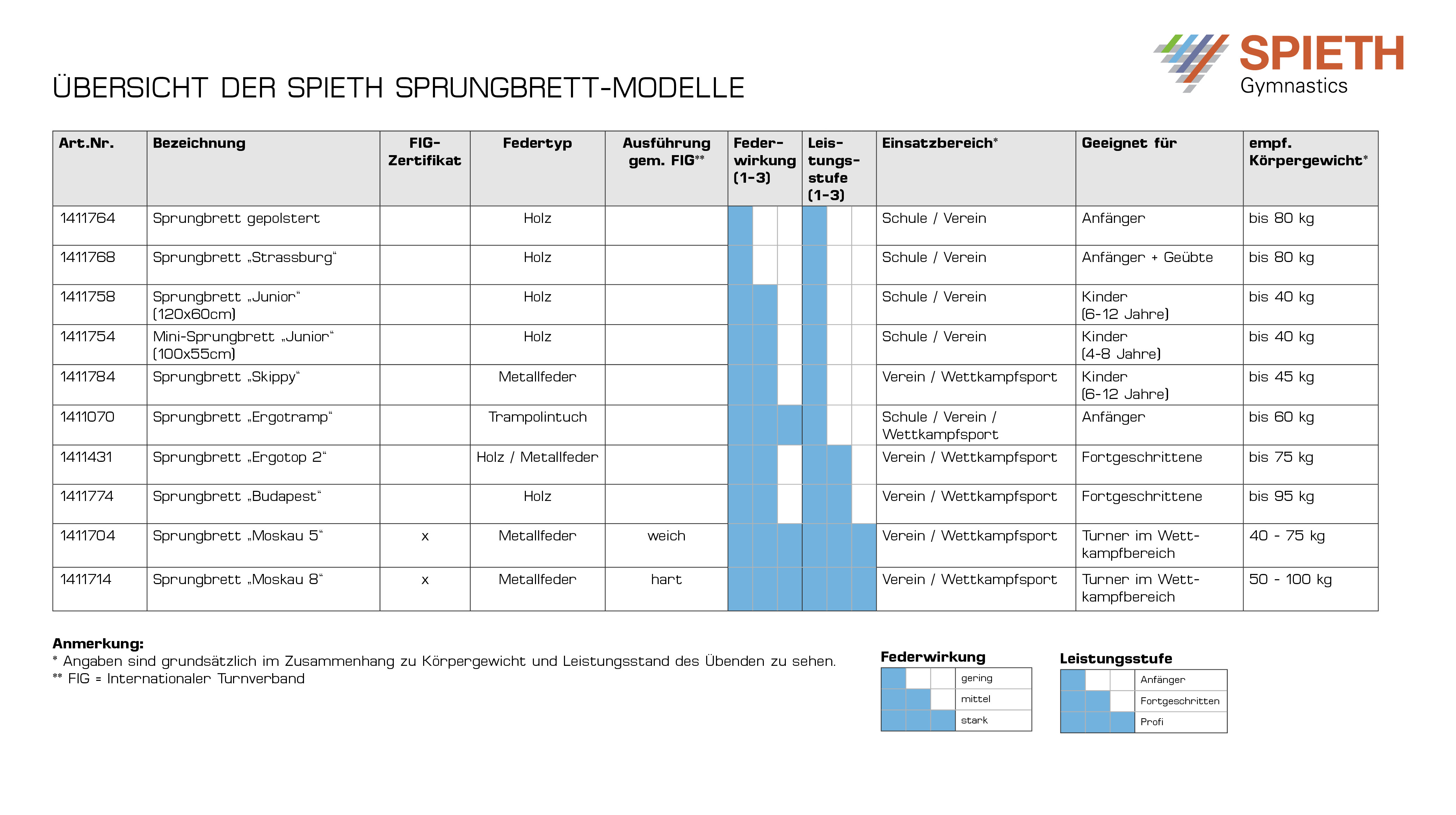 Durch den Weltturnverband (FIG) gibt es bestimmte Regularien, die für den Wettkampfeinsatz vorgeschrieben sind: so muss es zwei verschiedene Varianten an Sprungbrettern in weich und hart geben und ein Sprungbrett die Maße 120x60x22 cm einhalten. Die SPIETH Modelle Moskau 5 (weich) und Moskau 8 (hart) erfüllen diese Anforderungen und sind FIG-zertifiziert.
